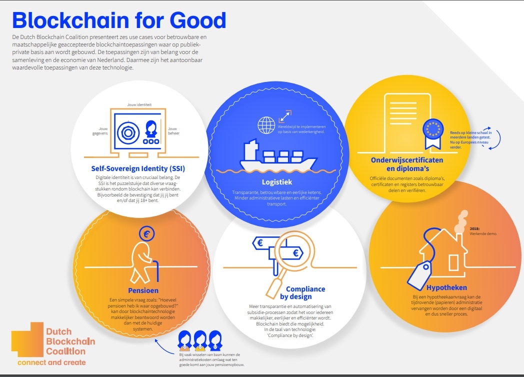 Aan het eind van vorig jaar is het visiedocument verschenen. In het document worden 5 use cases voor betrouwbare en maatschappelijke geaccepteerde blockchaintoepassingen benoemd waar op publiek-private basis aan wordt gebouwd. De hypotheek case is toegevoegd aan dit rijtje. Wil je in een overzicht weten waar we met de use cases aan werken? Zie onze infographic!
